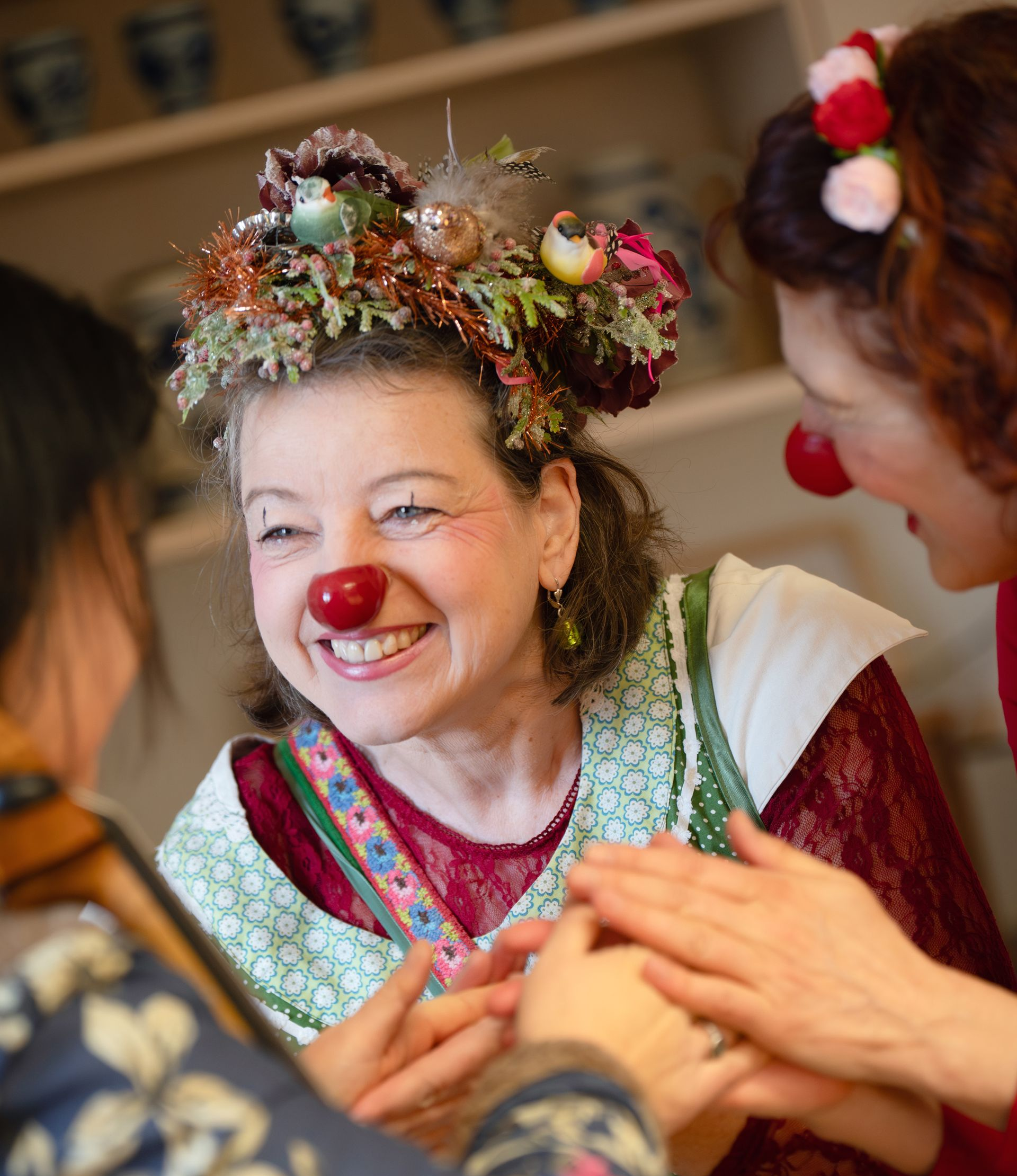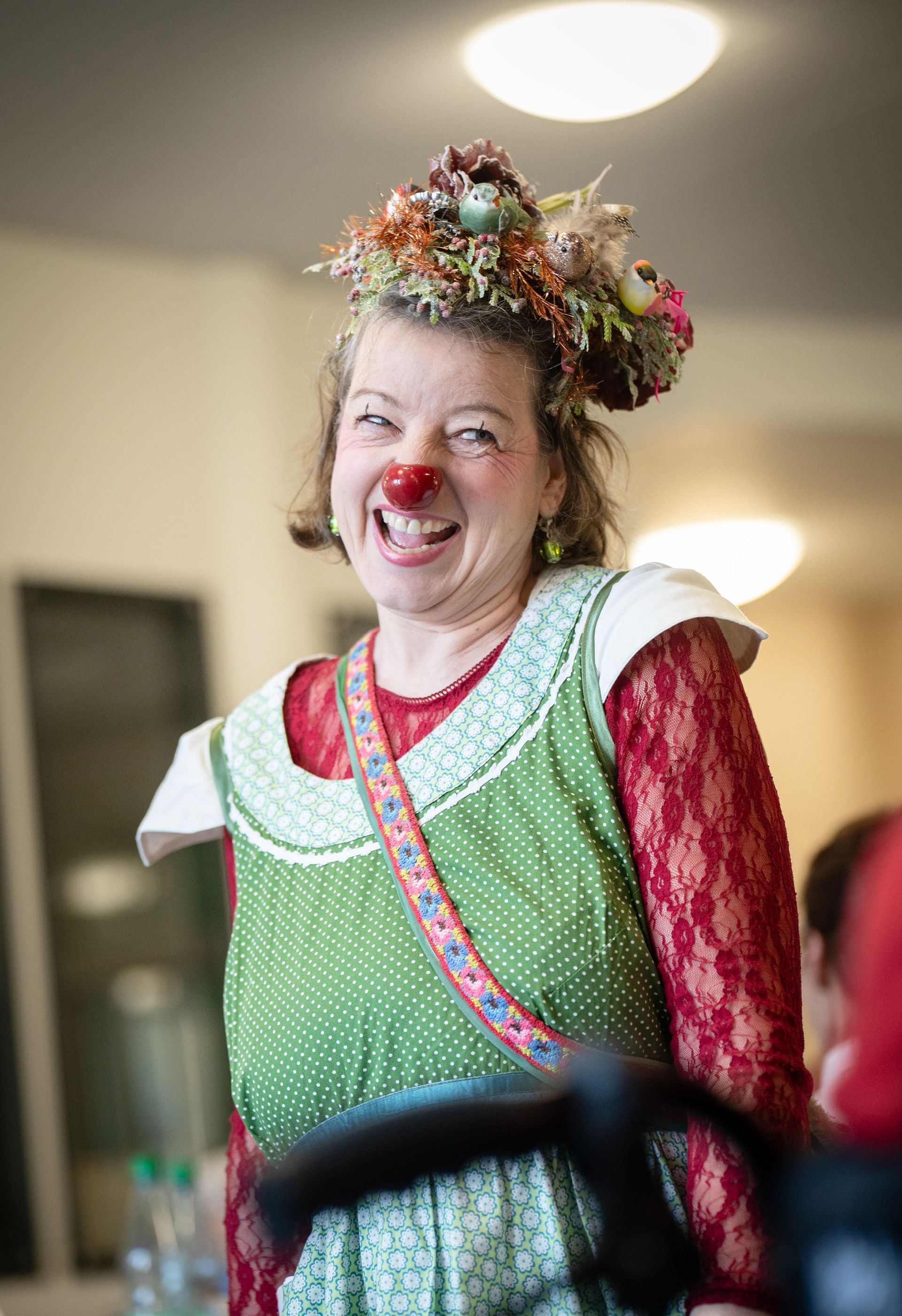 Fluse reist mit Ihrem Nähkästchen an. Sie zeigt an Hand ihrer Requisiten, welche nicht ganz ernst zu nehmende Lösungen sie als Klinik-Clownin für ganz ernst zu nehmende Sorgen und Nöte in Altenheimen, Krankenhäusern und Hospizen hat.